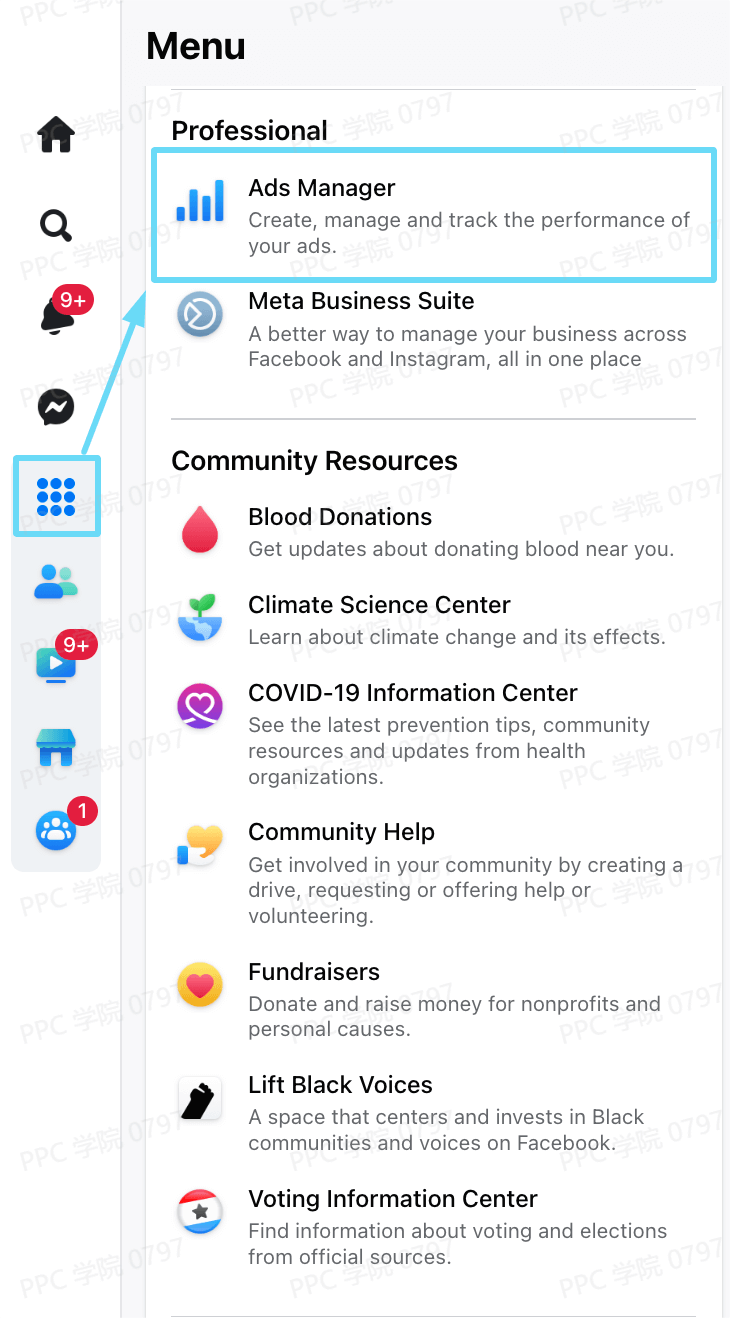 2. 在Facebook信息流(首页)左侧边栏点击九宫格菜单图标,向下滚动至“Professional”部分选择“Ads Manager”。