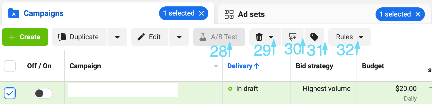 2. 搜索筛选栏(可以查找广告账户中的任何内容:广告系列、广告组、广告等)