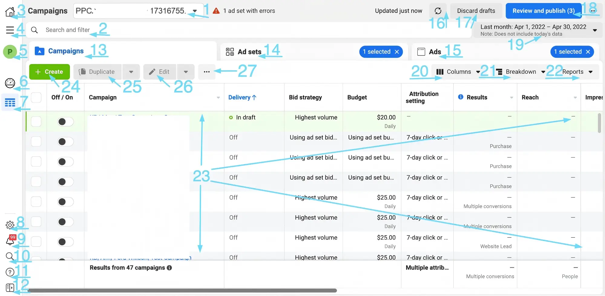 初次接触Facebook广告管理器时,可能会觉得有些复杂。下面我们将对各功能做减少概览。