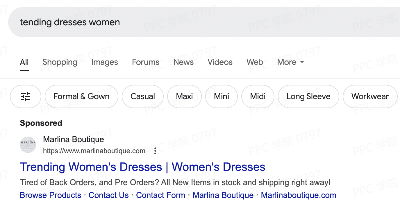 搜索“tending dresses women”关键词显示的广告