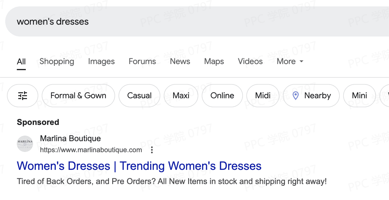 例如,如果在包含关键词“women's dresses”的广告组中投放了动态关键词插入的广告,当用户搜索“women's dress sale”(该搜索词与您某个关键词足够接近从而触发广告)时,他们看到的广告文案就会显示“women's dresses”。