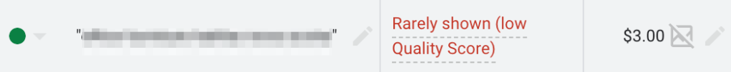 如果您的关键词得分为 1 或 2 时,您会在关键词状态栏中看到“展示频率低(质量得分过低)”的警告。
