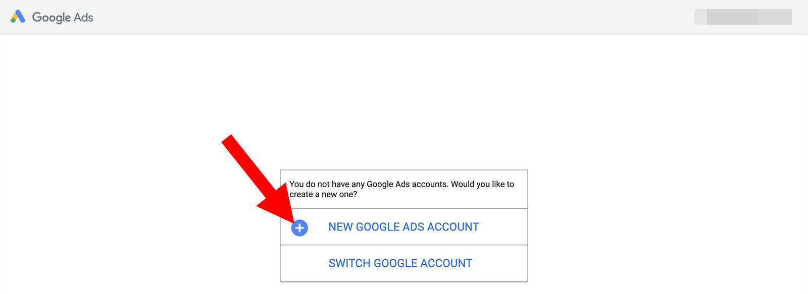 访问谷歌广告主页,点击蓝色的“立即开始”按钮。如果您尚未登录,请输入您的谷歌用户名和密码。然后点击“+NEW GOOGLE ADS ACCOUNT”链接。