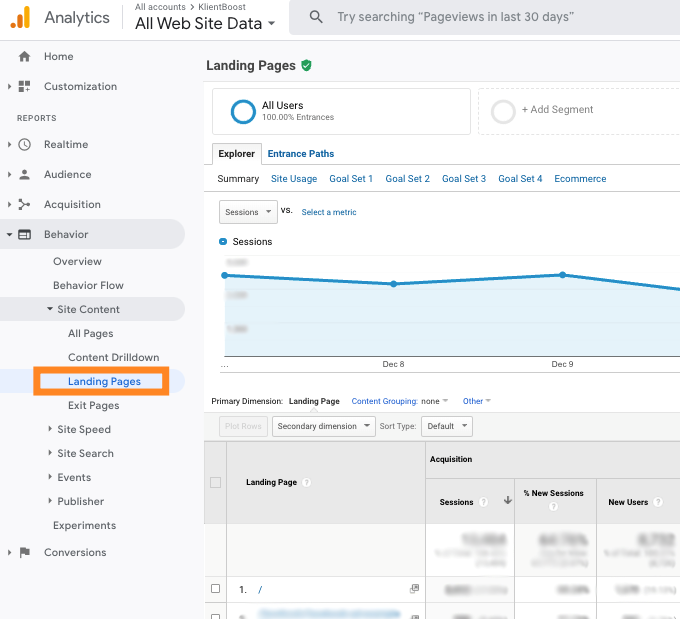 在谷歌分析中,如果你进入行为 > 网站内容 > 落地页,你会看到一个完整的数据面板,里面统计着所有落地页的相关指标。