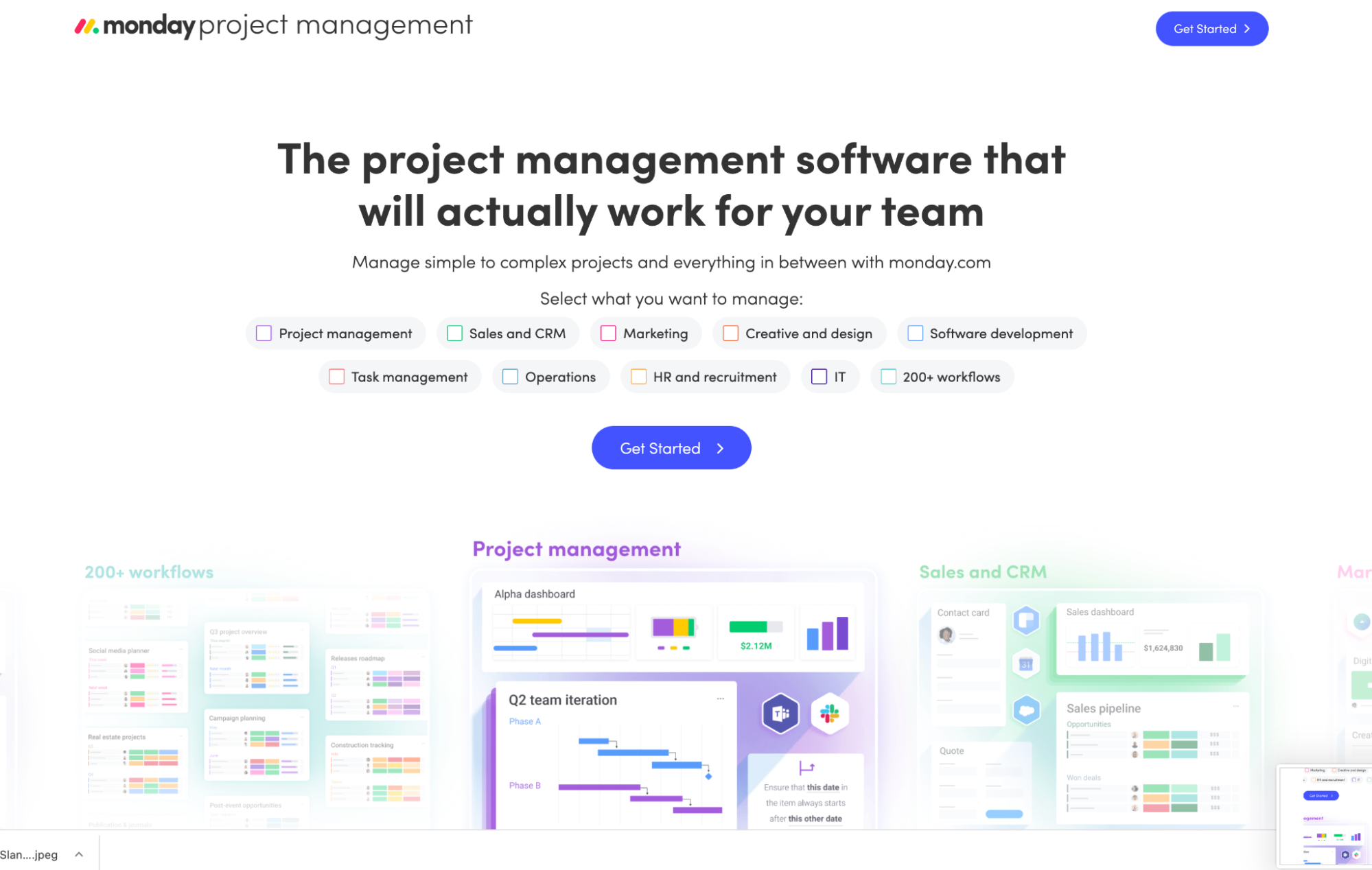 Monday的落地页仅提供一个行动号召“立即开始”,这是页面上唯一可选操作