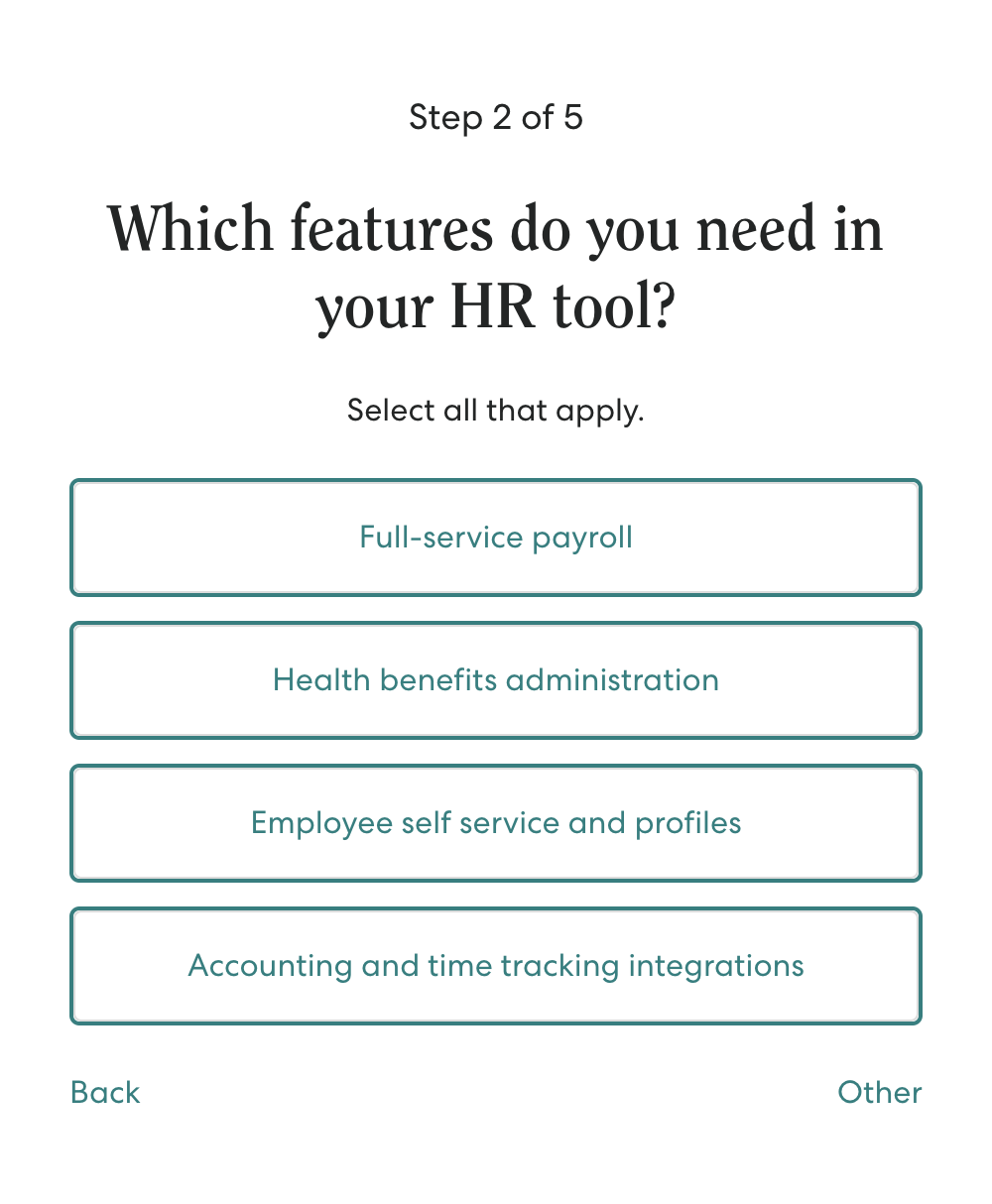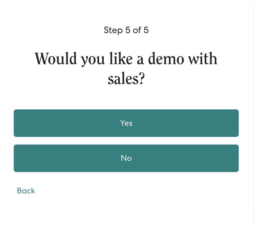 Gusto采用标准的线索收集落地页及表单(内置逻辑),直接在页面中完成潜在客户的初步筛选。其秘诀在于运用了面包屑分层技术。该技术将冗长的表单字段拆分为多个更简短、压力更小的步骤,并按照从低压力问题(非承诺性问题)到高压力请求(联系方式)的渐进顺序排列,让访客通过微转化逐步完成整个流程,从而显著提升提交率。